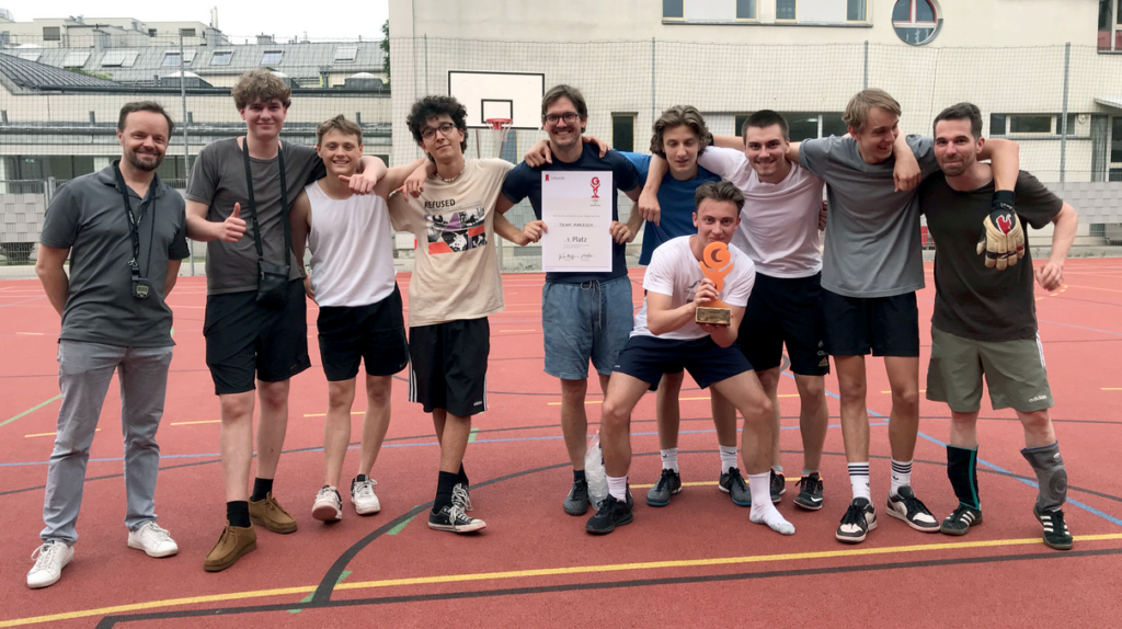 Bei Temperaturen über 30 Grad kämpften vier Schüler/innen-Teams mit Lehrerunterstützung um die begehrte „El Graphico“-Trophäe. Mit technischen Finessen und großem Einsatz begeisterten die Teams die Zuschauer. Im Spiel um Platz drei besiegte das Team „Niko“ das Team „Team Team“ deutlich mit 8:0. Im Finale besiegte das Team „Maresch“ das beherzt kämpfende Alumni-Team „Pulpo Rust“ in einem Finalkrimi nach 3:3 in der Verlängerung erst im Elfmeterschießen und nahm die „El Graphico“ Trophäe unter großem Applaus in Empfang. Danke an alle Teilnehmer/innen und Fans. Wir sehen uns beim „El Graphico“ 2023!>br>